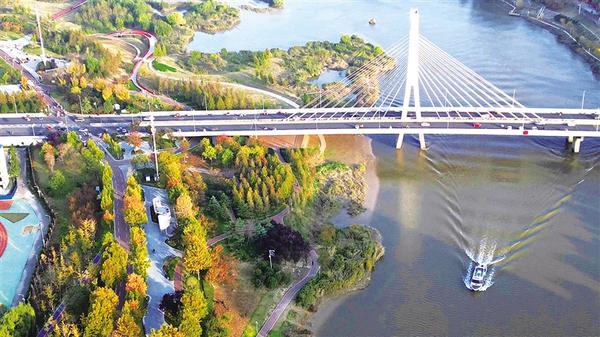 11月5日下午,一只小艇劃開碧波,從大慶路橋下駛過,和被秋色染得五彩斑斕的沙潁河公園交相輝映,使得沙潁河更加靈動(dòng)而秀美。