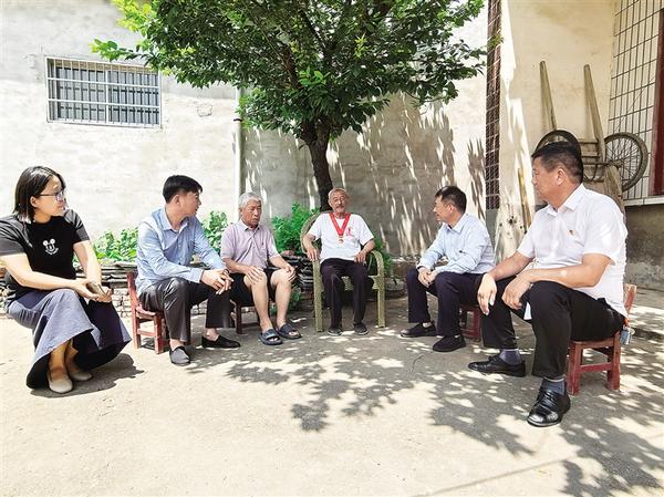 7月1日,沈丘縣付井鎮(zhèn)老黨員楊井明(右三)佩戴“光榮在黨50年”紀(jì)念章,為前來看望他的鎮(zhèn)村黨員干部講黨史。據(jù)了解,1968年7月1日,楊井明正式成為一名中國共產(chǎn)黨黨員。