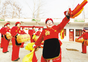 ?、芊鰷峡h江村鎮(zhèn)江南盤鼓隊正在村室緊張排演節(jié)目。春節(jié)期間,她們走上街頭,為當地群眾送上文化大餐。 (記者 王 映 攝)