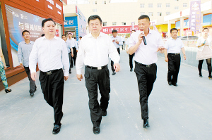 周口市委書(shū)記、市人大常委會(huì)主任徐光(中)一行在項(xiàng)城市委書(shū)記黃真?zhèn)ィㄗ螅┑呐阃掠^摩項(xiàng)目建設(shè)。