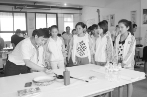 為弘揚(yáng)優(yōu)良傳統(tǒng)文化,營(yíng)造熱愛(ài)書(shū)法繪畫(huà)藝術(shù)的良好氛圍,6月23日,項(xiàng)城市文聯(lián)邀請(qǐng)部分書(shū)畫(huà)家走進(jìn)項(xiàng)城市清華育英學(xué)校,開(kāi)展了“書(shū)畫(huà)家進(jìn)課堂”活動(dòng),讓師生們充分感受到了書(shū)畫(huà)的藝術(shù)魅力,激發(fā)了大家的學(xué)習(xí)熱情。圖為書(shū)法家為該校師生示范毛筆字的寫(xiě)法。